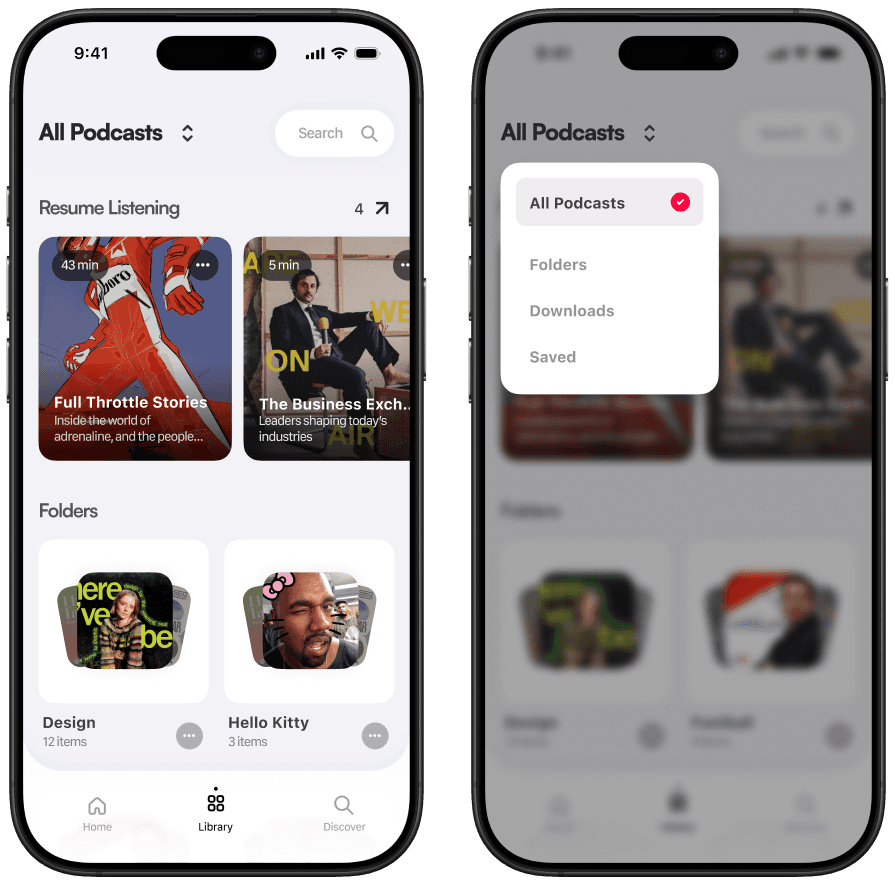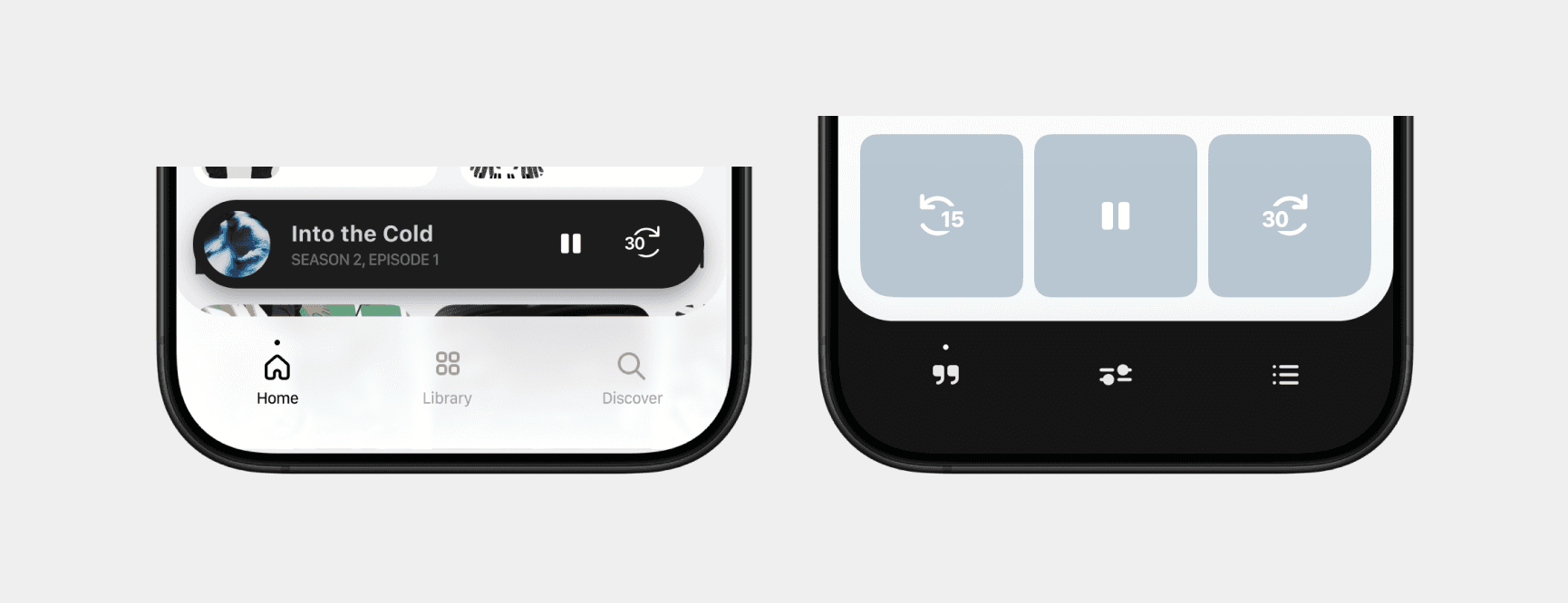 The primary navigation (Home, Library, Discover) supports discovery and quick access without pulling attention away. Inside the player screen, a secondary navigation layer surfaces listening-specific actions like playback controls, timestamps, annotations, and queue.