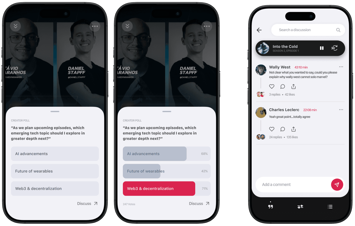 Creator polls are lightweight and time-aware, allowing listeners to respond when it’s convenient, not disruptive. Discussions are separated from playback to avoid interrupting passive listening, while still giving engaged users a clear place to respond.