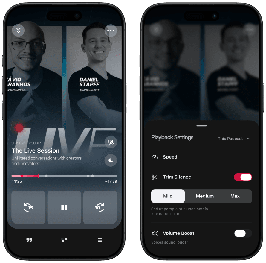 PocketCasts is loved for its clean UI, advanced playback controls, and features like silence trimming and episode archiving