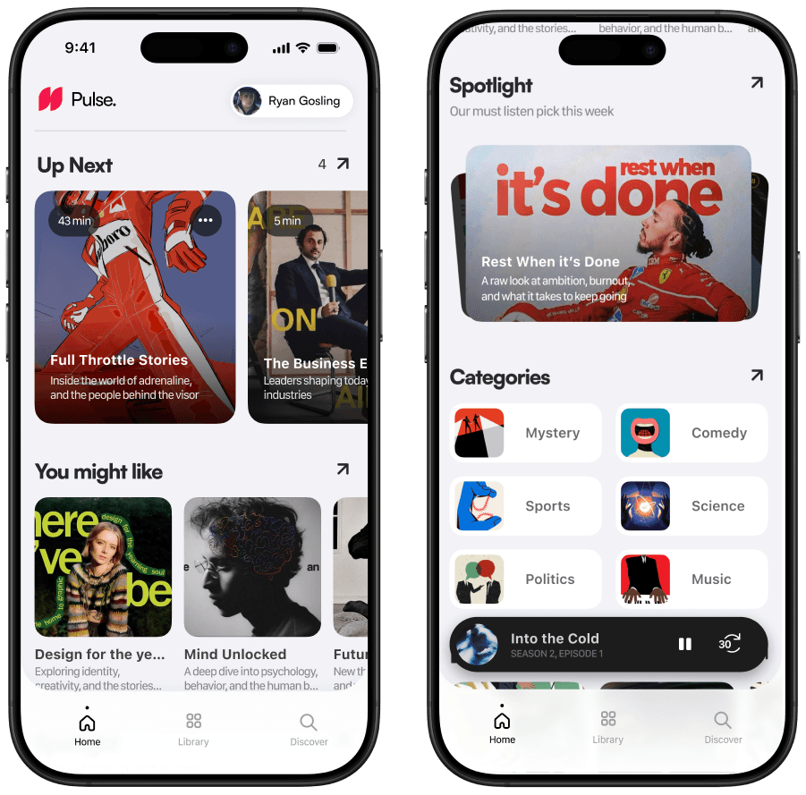 The home screen is built around continuity. I prioritized Resume Listening and Up Next so users can jump back in instantly, while discovery stays lightweight through a single Spotlight pick and categories.